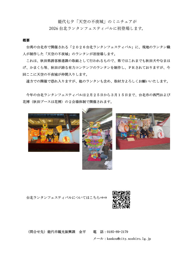 2013年、約1世紀の時を超えて復活した能代七夕「天空の不夜城」。中世能代を治めた檜山城主、安東愛季(ちかすえ)に因んだ高さ日本一の「愛季-ちかすえ-」(24.1m)。江戸時代、名古屋城を模した城郭灯籠を初めて作った大工宮腰嘉六に因んだ「嘉六-かろく-」(17.6m)。天にまで届く2基の城郭七夕灯籠が街を練り歩く姿は正に圧巻です!